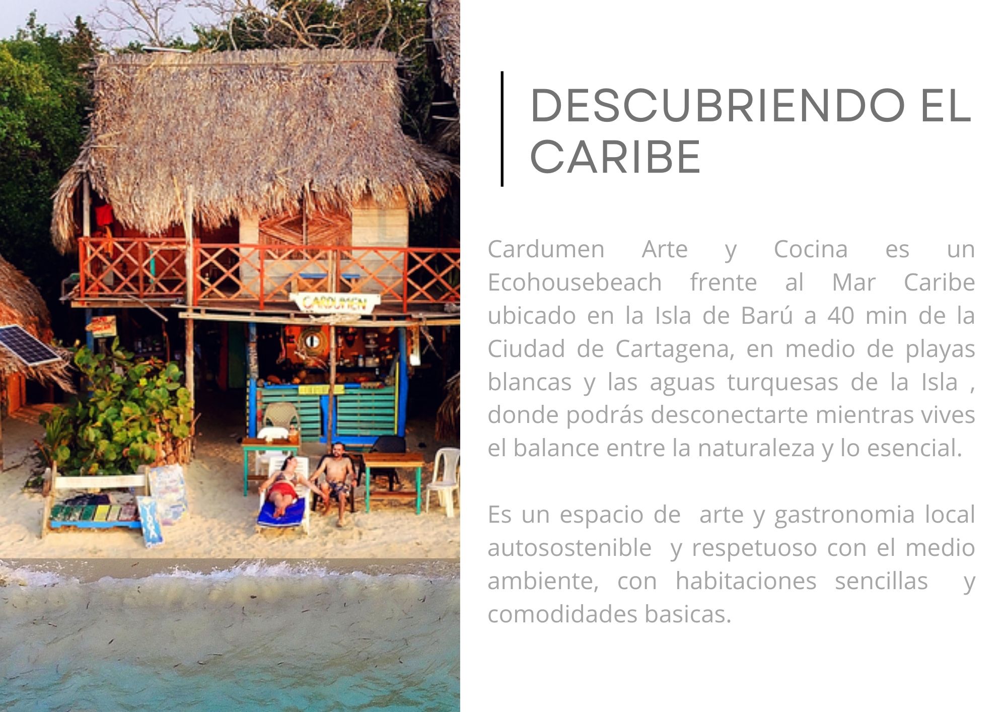 Welcome to Cardumen — Art & Cuisine, an ecohouse beach located right on the shores of the Caribbean Sea in Isla Barú, just 40 minutes from Cartagena.