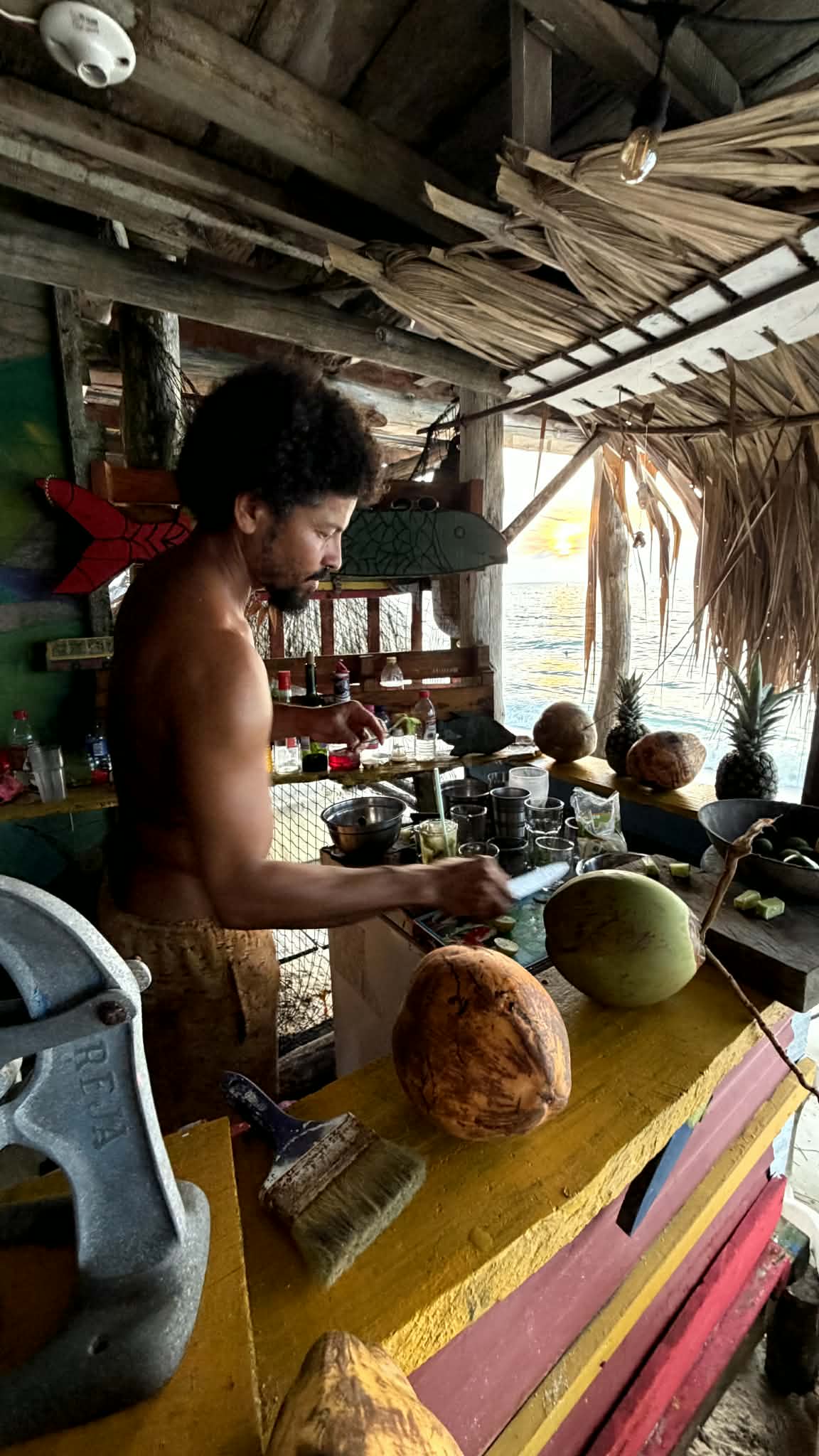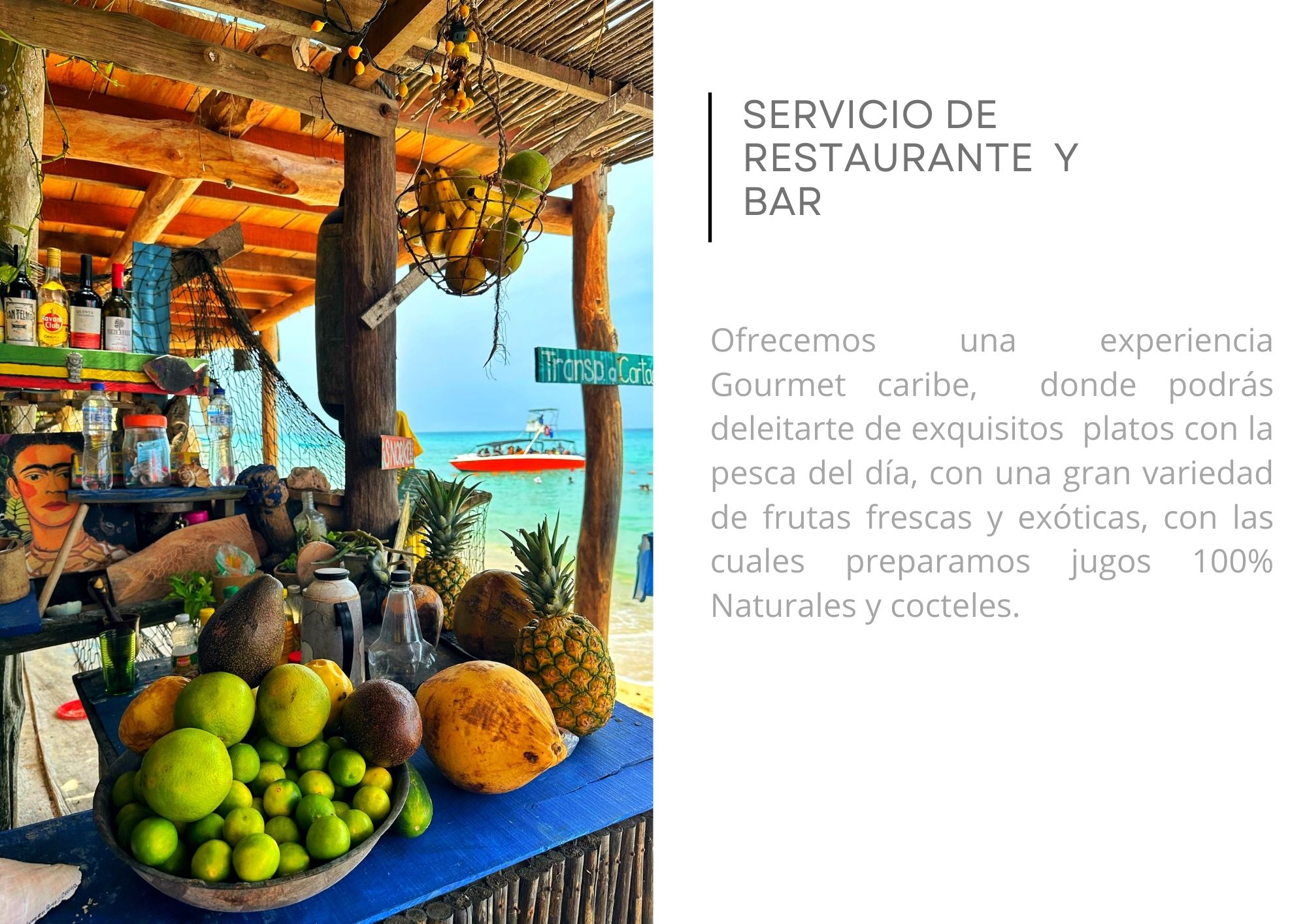 Nuestro espacio combina hospedaje sencillo y confortable con una propuesta gastronómica local y sostenible. Trabajamos con productos de la región (pescado del día, frutas frescas), preparamos jugos 100% naturales y cocteles caribeños, y cuidamos el entorno con prácticas responsables.