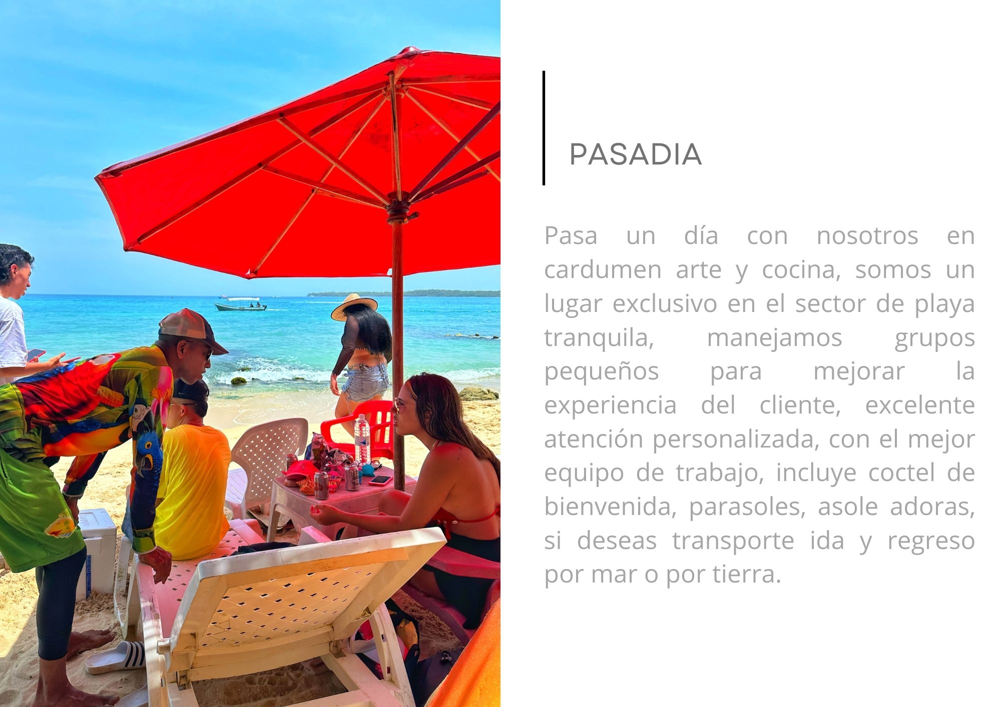 Cardumen maneja grupos pequeños para garantizar atención personalizada: recibimiento con cóctel de bienvenida, zona con parasoles y asoleadoras en la playa, y la opción de transporte ida y regreso por mar o por tierra. Ideal para familias, grupos de amigos, celebraciones íntimas y pasadías culturales.