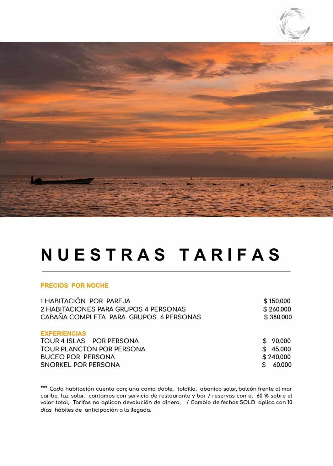 Date Changes: Only allowed with 10 business days notice prior to arrival. / Cambios de fecha solo con 10 días hábiles de anticipación.